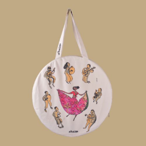 Ravann instrument bag| tailored for the size of your ravann | illustration depicting mauritian olden days - musicians of a sega group | Size L : diameter : 48 cms.